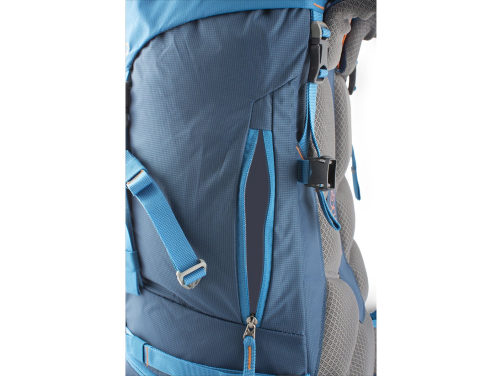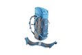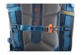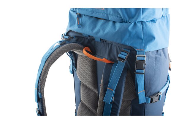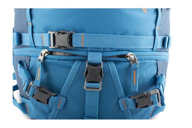 Jako tradičně začneme odspodu, ovšem zde už nenalezneme pláštěnku, jako je tomu u menších verzí, ale nezoufejte, pláštěnka bude, jen o něco výš. První dvě věci, které vás zaujmou jsou jistě dvě poutka se sponami, ty slouží k uchycení cepínů, případně trekkingových holý. Cepín se protáhne poutkem a zajistí se sponou, rukojeť se poté zajistí ještě horními velcro pásky. Na stejné úrovni se pak po stranách nachází dvě poutka na lyže. O kousek výše si můžeme všimnout vstupu do spodní komory, který je vybaven ještě pojistnou sponou a hned nad tímto vede spodní stahovací popruh. Po stranách se dá upravovat jeho délka přezkami a uprostřed je pak opatřen sponou. O kus výše se pak nachází dvakrát série oček pro nastavení výšky horních poutek na hole/cepíny a druhý stahovací pás, tentokrát se třemi sponami. Mezi těmito popruhy vede na pravé straně zip, jež je bočním vstupem do horní komory.