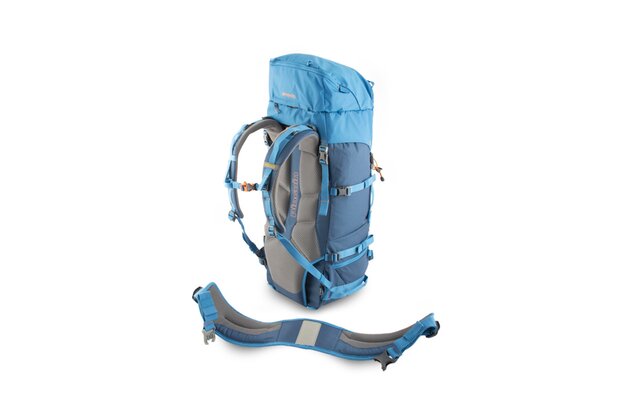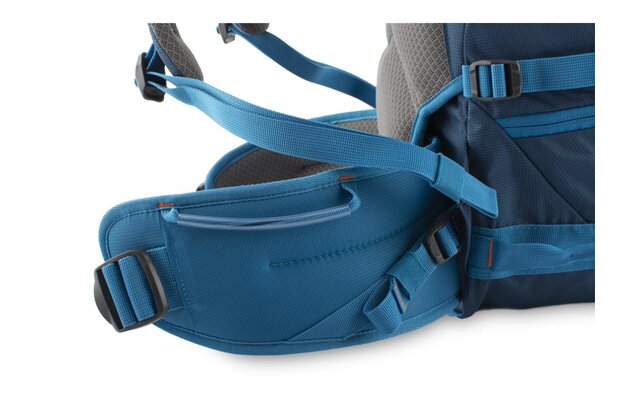 Bederní popruh zajišťuje vystýlka, která je nahoře spojena suchým zipem se zádovým systémem, tento rozepněte a stélku vysuňte