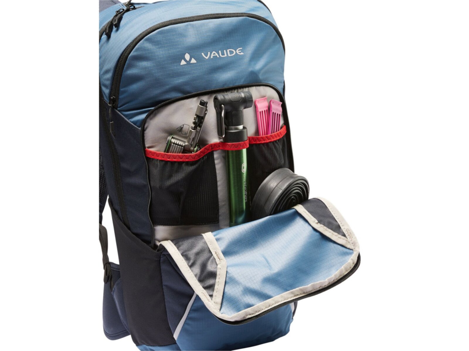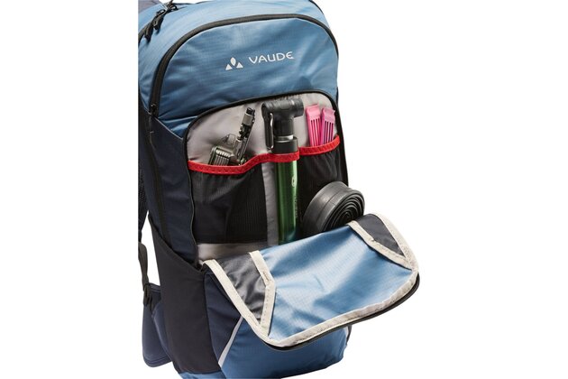Samostatná přihrádka v horní části, přihrádka na nářadí se síťovými kapsami, boční síťové kapsy, bederní kapsa, reflexní prvky, držák světla, pláštěnka