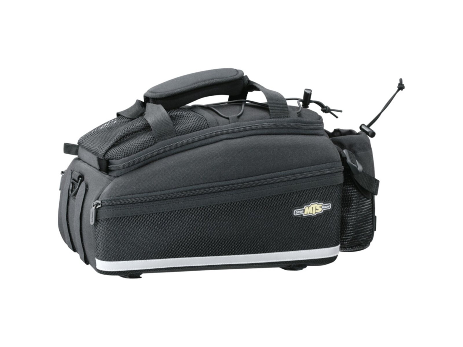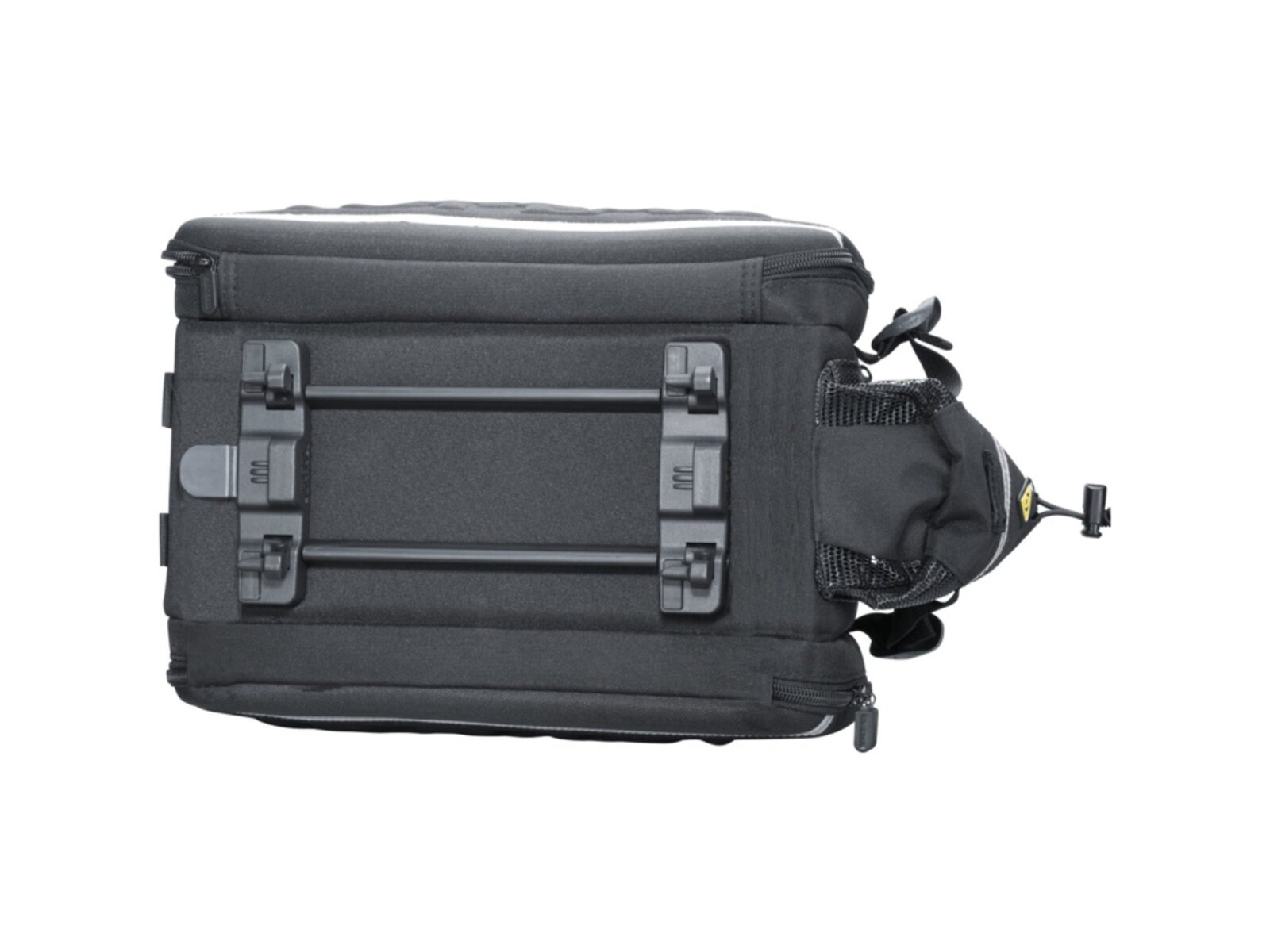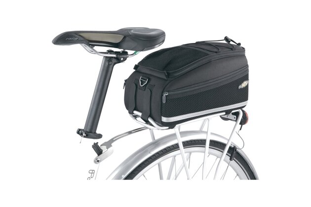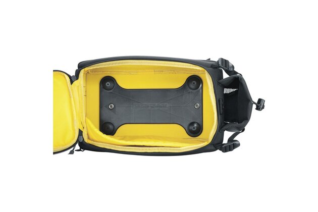 Odolná brašna na nosič s rozdělenou hlavní komorou a dvěma pevnými bočními kapsami. Zadní držák na láhev s vodou. Upevnění pomocí popruhů nebo integrované desky kompatibilní se systémy KLICKfix® / Racktime® Snapit nebo Vario.