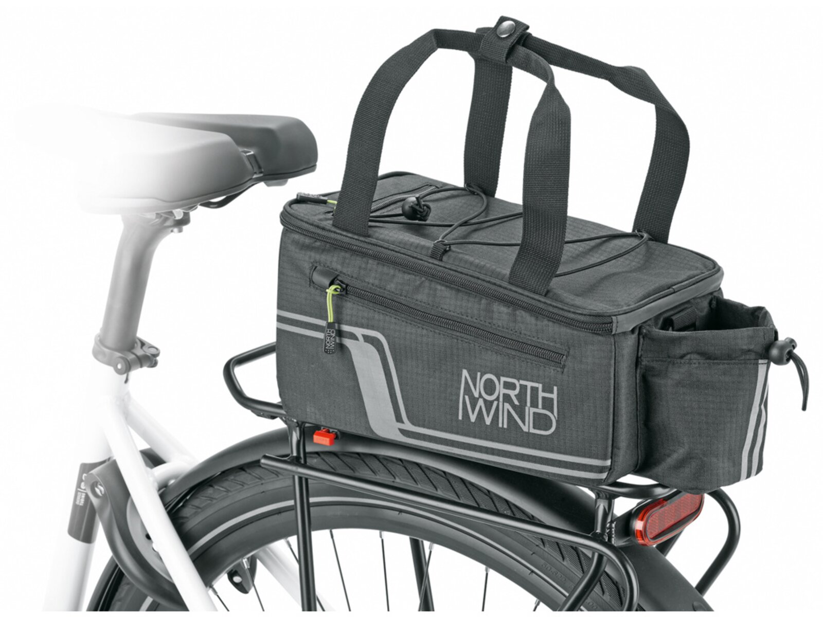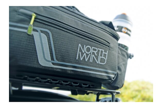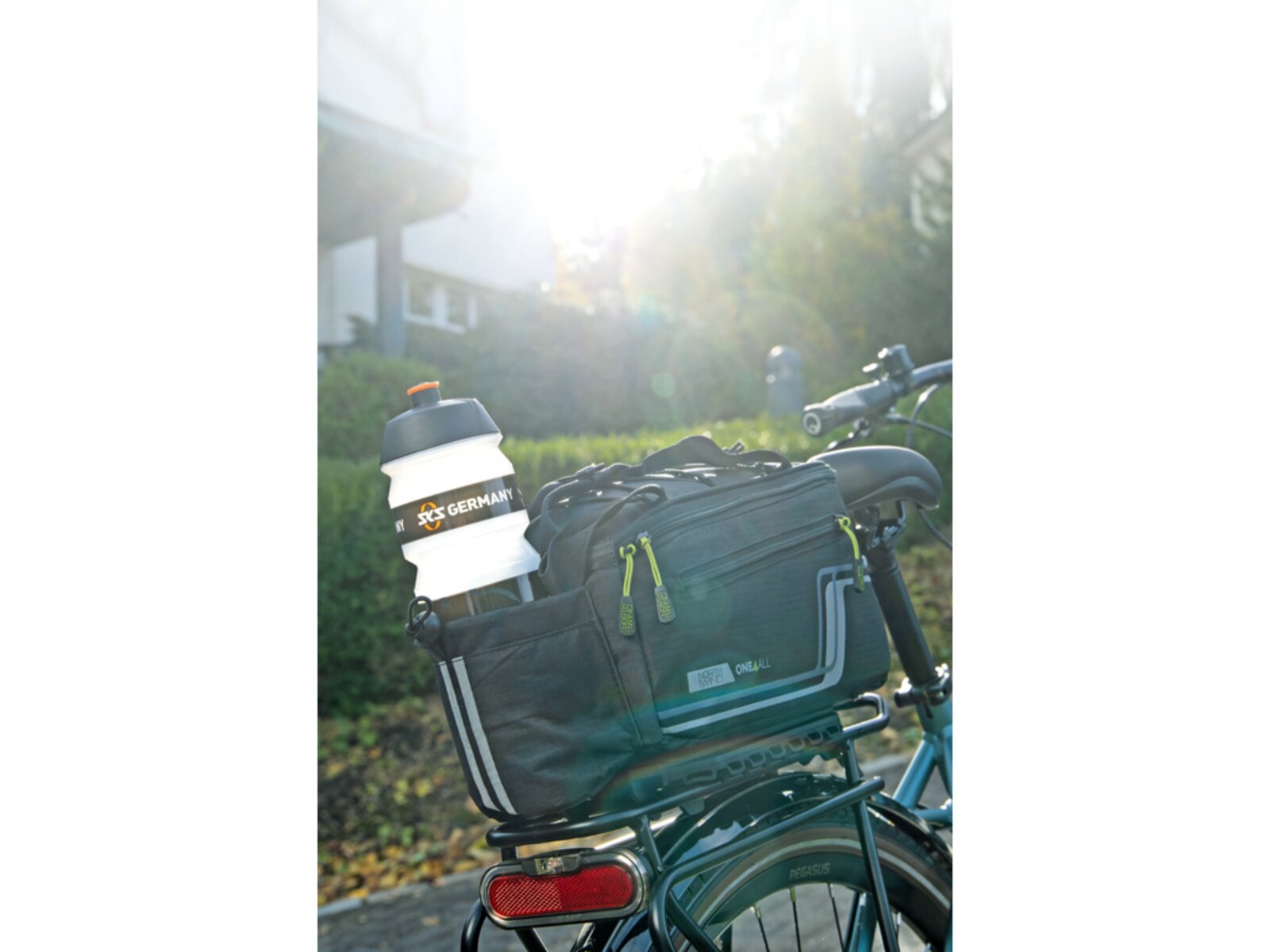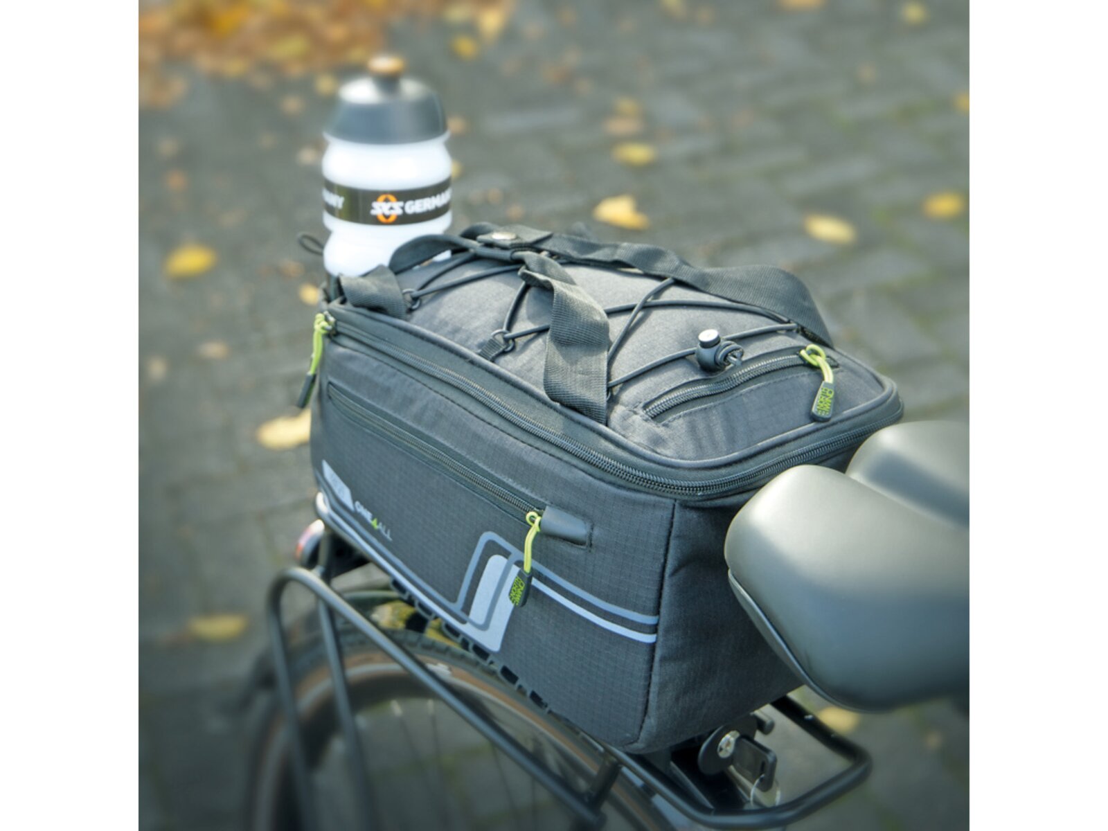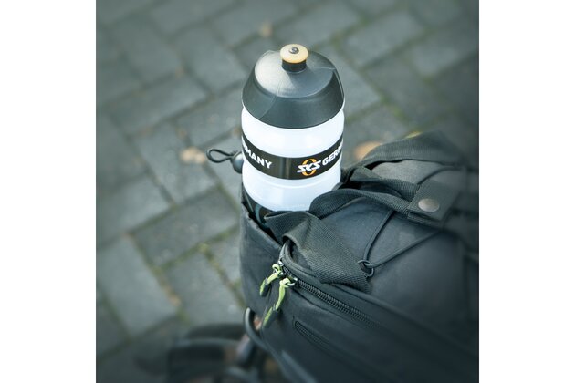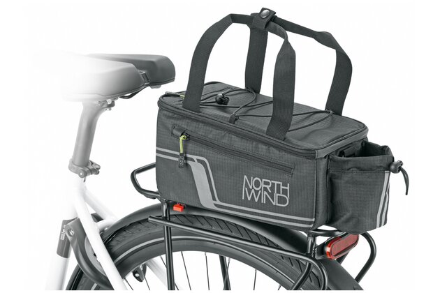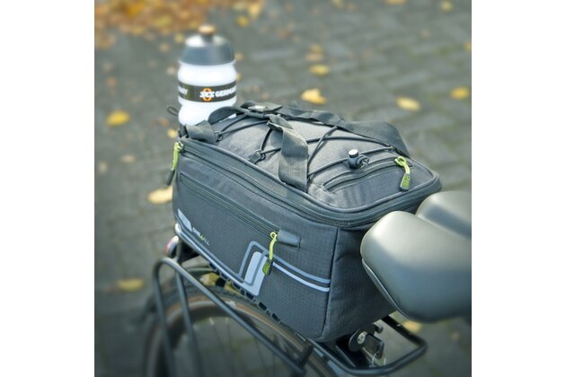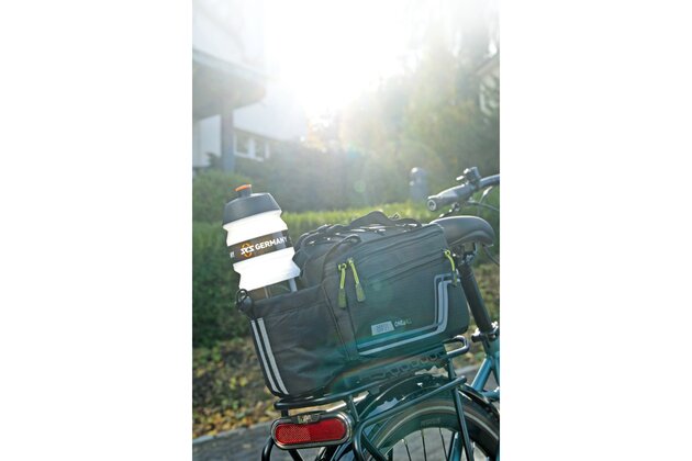 Multifunkční brašna s držákem nápojů a přihrádkami. Ty jsou umístěny po stranách a v horní kapse, aby byl rychlý přístup k mobilnímu telefonu, klíči a peněžence. Úložná kapsa z elastické síťoviny umožňuje převážet další zavazadla. Pláštěnka udrží tašku a obsah v suchu, zatímco reflexní prvky na voděodpudivé nylonové tkanině zajišťují viditelnost ve tmě.