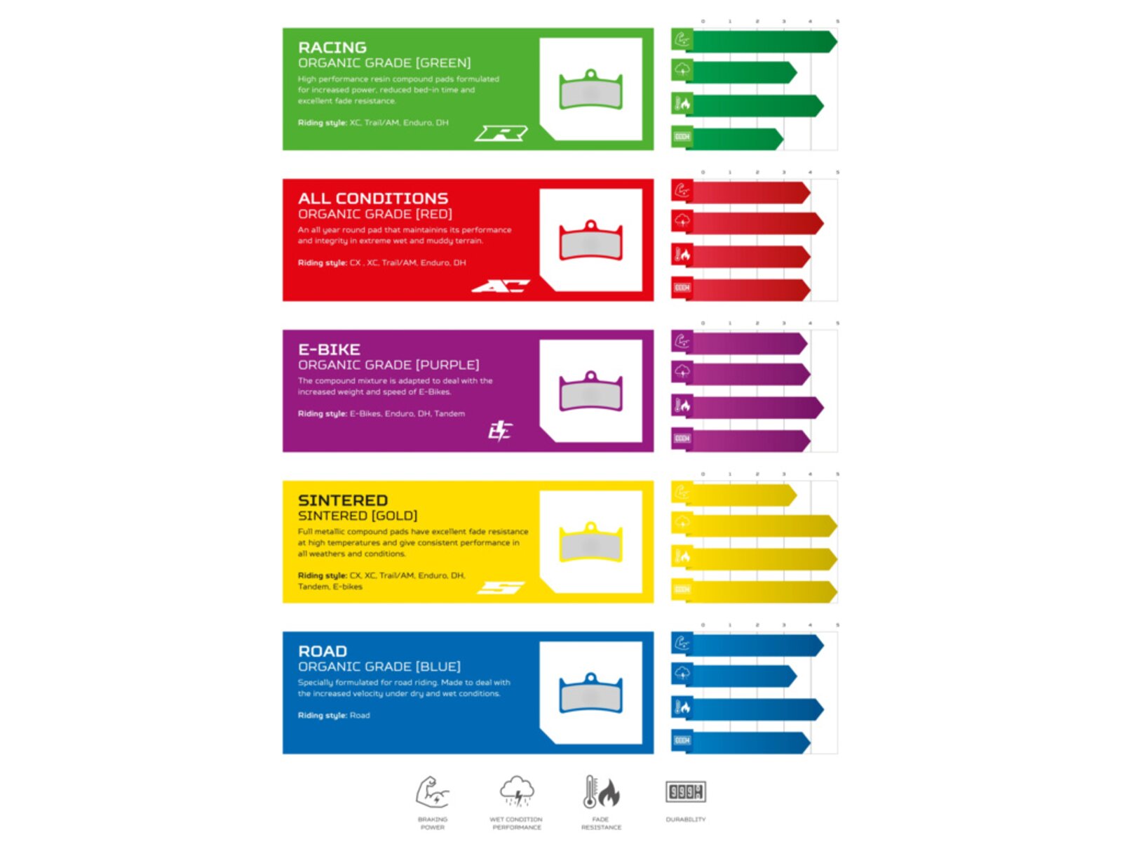 - Zelené - Vysoce výkonné organické brzdové destičky jsou navrženy pro zvýšený brzdný výkon, zkrácení doby záběhu a vynikající odolnost vůči slábnutí výkonu. Určeno pro XC, Trail/AM, Enduro, DH.