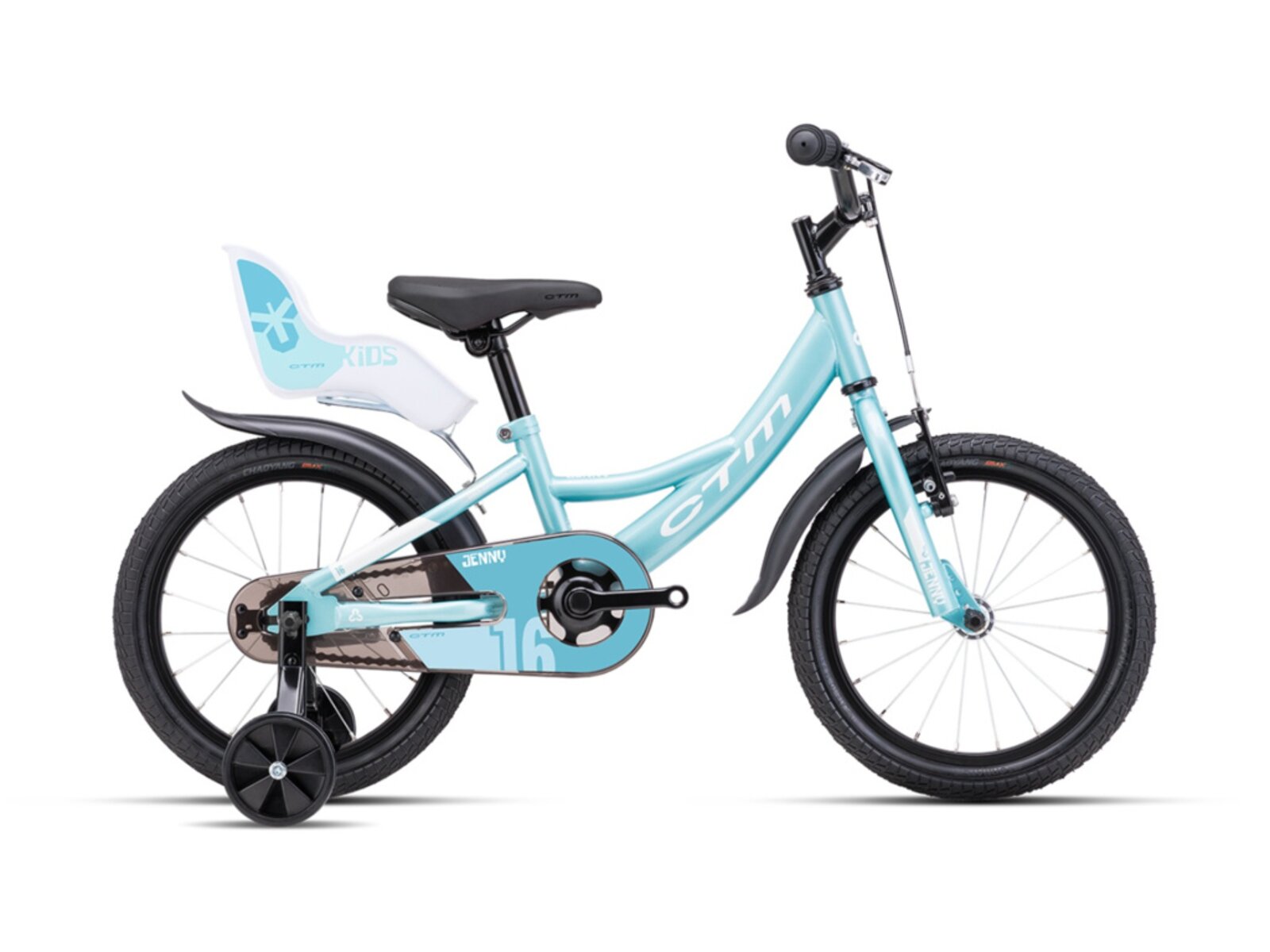 CTM Jenny je 16palcové dívčí kolo pro děti s výškou postavy od 100 do 120 cm. Má pevné ocelové tělo pro dobrou stabilitu a standardně je dodáváno s balančními kolečky, plastovými blatníčky a bezpečnostním krytem řetězu. Mladé slečny jistě ocení i sedátko pro panenky.