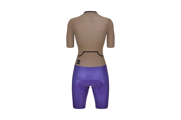 SANTINI Viper představuje vrchol technologického vývoje pro triatlonistky, které usilují o špičkový výkon. Tato kombinéza s "Sleek fit" střihem disponuje prodlouženými rukávy a nohavicemi, což výrazně snižuje odpor vzduchu během cyklistické části. Materiály byly pečlivě testovány ve větrném tunelu, aby zajistily co nejhladší proudění vzduchu. Horní díl s ochranou UPF50+ chrání pokožku před intenzivním sluncem, zatímco lepené lemy rukávů dokonale přilnou k paži bez nepříjemného tření. Šortky z kompresní tkaniny s neupraveným zakončením (raw-cut) podporují svalovou regeneraci a díky vnějšímu protiskluzovému gripu v rozkroku zajišťují stabilní pozici v sedle. O maximální pohodlí se stará specifická triatlonová vložka IMG s technologií Tower Gel Core, která exceluje v tlumení nárazů na kole, ale nijak nepřekáží při plavání ani běhu.