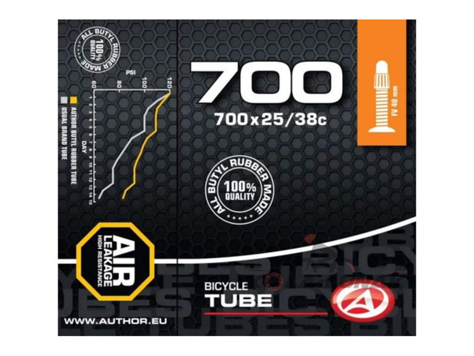 Duše AUTHOR 700x25/38C vyrobená ze 100% butylové pryže s velmi nízkou propustností pro plyny. Udrží tlak vzduchu v pneumatice jízdního kola po delší dobu, než duše vyrobené ze syntetické pryže.