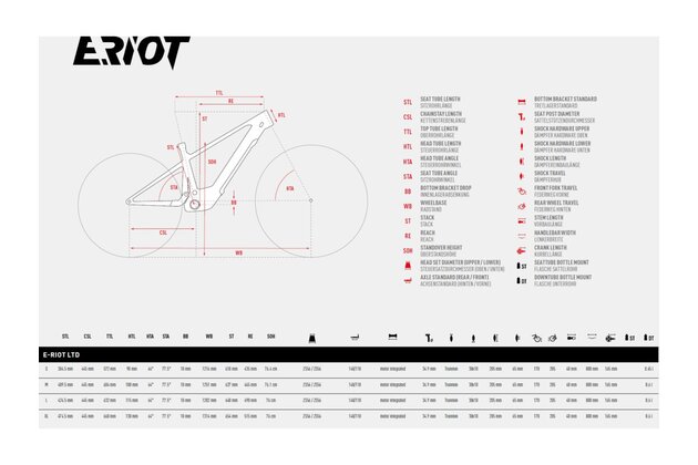 - E-RIOT LTD: exkluzivní verze s prvotřídním vybavením jako jsou komponenty SRAM/RockShox, DT Swiss karbonové ráfky, doplňky Truvativ, 220mm kotouče vpředu i vzadu a bezdušové pláště včetně PTN vložek do plášťů
