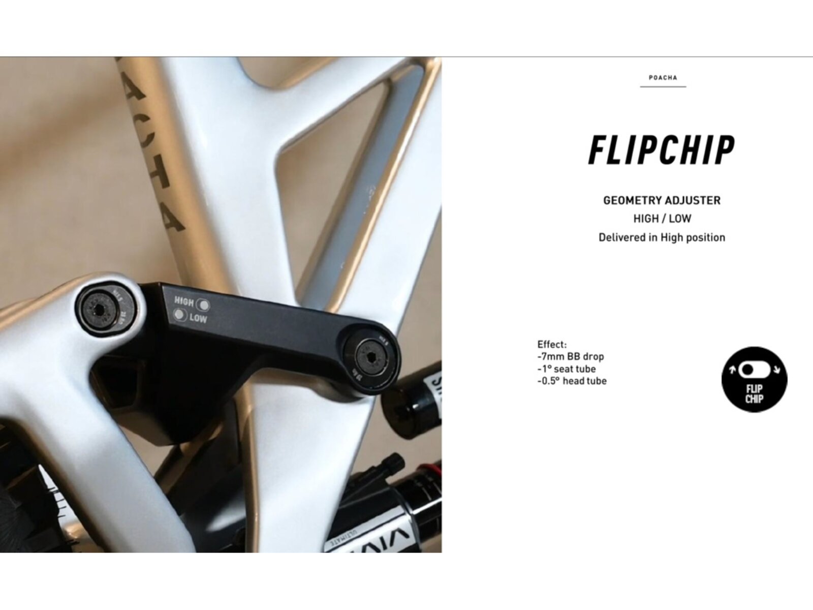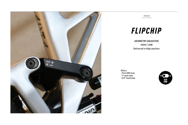 Se 180 mm zdvihu vpředu i vzadu má POACHA dostatek rezerv pro velké horské lajny, ale zároveň zůstává obratný pro rychlé změny směru a technické triky. Díky Reach Adjuster si můžete doladit délku rámu a rozvor o + - 5 mm. Integrovaný flip chip navíc usnadňuje úpravu geometrie podle terénu a stylu jízdy. Základním nastavení „High“ lze přepnout do „Low“ – sníží se střed o 7 mm, sedlový úhel se položí o 1° a hlavový úhel o 0,5°. V režimu High pomáhá strmější sedlový úhel při šlapání, zatímco režim Low je ideální na sjezdy a technické pasáže.