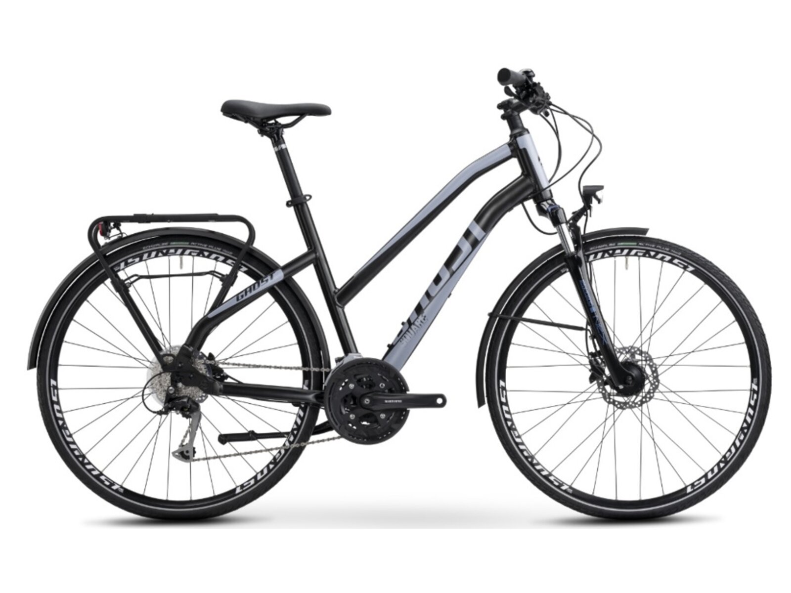 GHOST Square Trekking Essential je maximálně funkční a spolehlivé kolo, vybavené vším, co potřebujete pro každodenní jízdu. V elegantních barvách a jednoduchém a čistém vzhledu dokáže zaujmout na první pohled. S kvalitní výbavou, ke které mimo jiné patří nábojové dynamo pohánějící LED osvětlení, blatníky a speciálně navrženým nosičem je jízda nejen bezpečná, ale také praktická! Verze Ladies má navíc sníženou horní rámovou trubku pro pohodlný výstup a nástup. A pokud to všechno nestačí, promyšlená geometrie přesvědčí ty, kteří chtějí víc – absolutně pohodlný a extrémně hladký chod.