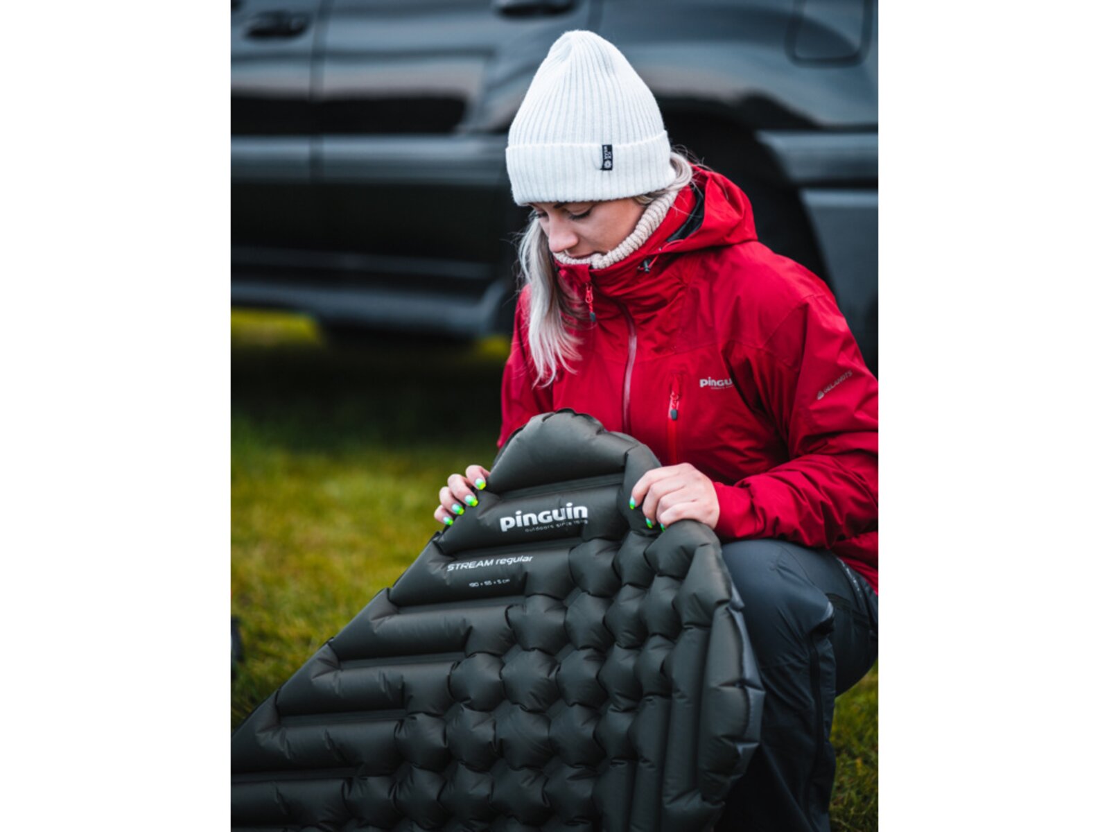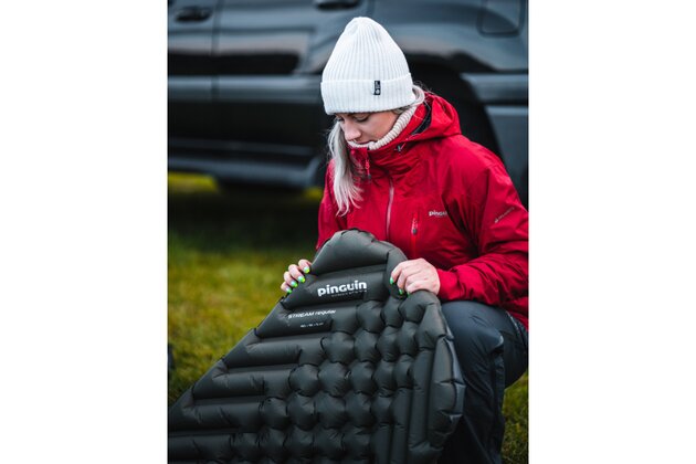 Nafukovací karimatka PINGUIN Stream Mummy je minimalistická a ultralehká, navržená pro optimální pohodlí a sbalitelnost. Má mumiový tvar, šířku 55 centimetrů a tloušťku 5 cm po nafouknutí. Je vyrobena z nylonové tkaniny s Ripstop úpravou a vláknem o tloušťce 40D, což zaručuje vysokou odolnost. Unikátní konstrukce s jednou komorou (SCC - Single Chamber Construction) a rovnoměrné svařování švů zajišťují, že komory netvoří tubusy, čímž se zvyšuje komfort užívání.
