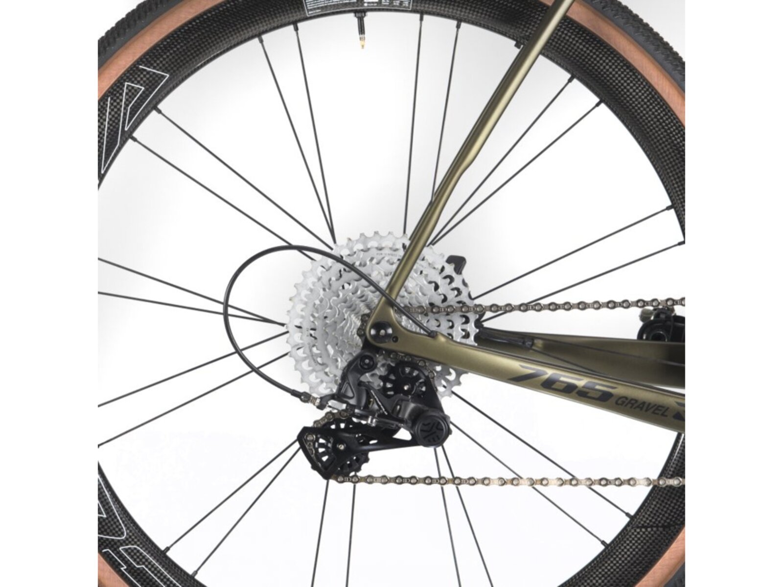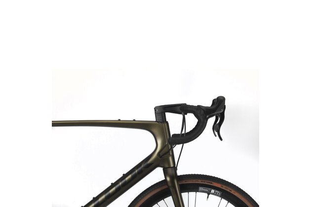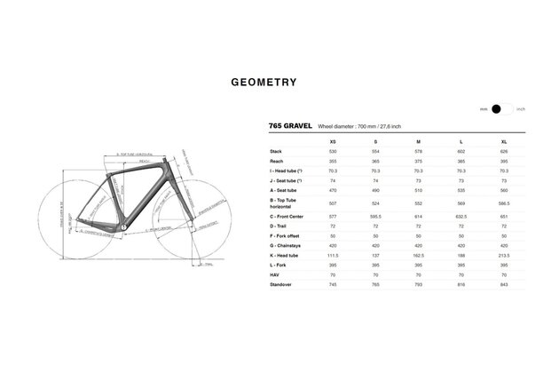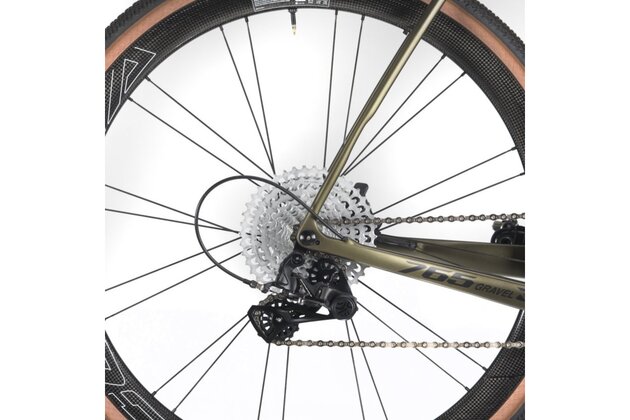 Model 765 Gravel RS Ekar je osazen 13rychlostní sadou Campagnolo Ekar a zapletenými koly CORIMA Carbon Essentia 40 Hookless, které jsou obuty do plášťů HUTCHINSON Touareg v rozměru 700x40.