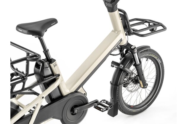O komfortní jízdu se stará přední odpružená vidlice SR Suntour MOBIE34 se zdvihem 70 mm a teleskopická odpružená sedlovka se zdvihem 90 mm. Cargokolo je vybaveno zadním nosičem s nosností 70 kg a je kompatibilní se systémy MIK HD i QL3, takže upevnění dětské sedačky, brašen nebo přepravních boxů je otázkou vteřin.