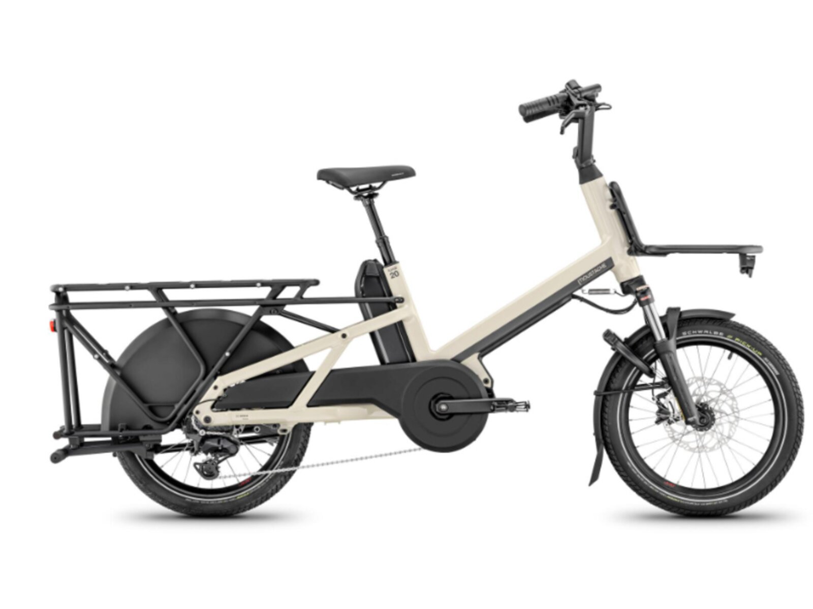 MOUSTACHE Lundi 20 Cargo 3 v elegantní barvě Silk Grey je spolehlivý a všestranný elektrický nákladní bike navržený pro městský provoz s důrazem na bezpečnost, komfort a funkčnost. Silný motor Bosch Cargo Line Smart System s točivým momentem 85 Nm si hravě poradí i s těžkým nákladem nebo jízdou do kopce. K dispozici jsou dvě varianty baterie – 545 Wh pro běžné využití nebo 800 Wh pro delší trasy. O komfortní jízdu se stará odpružená vidlice SR Suntour MOBIE34 se zdvihem 70 mm a teleskopická odpružená sedlovka. Díky robustnímu zadnímu nosiči s nosností 70 kg a kompatibilitě se systémem MIK HD a QL3 lze snadno připevnit sedačky, boxy nebo brašny. S výbavou Shimano a spolehlivými hydraulickými brzdami Magura je jízda vždy pod kontrolou. Nechybí ani integrovaný zámek AXA Immenso a světlo AXA 30 pro větší bezpečnost.