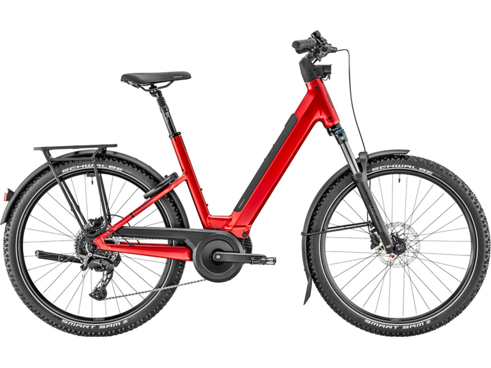 MOUSTACHE Samedi 27 Xroad 4 OPEN 600 je spolehlivé a všestranné trekingové elektrokolo vybavené nejnovějším motorem Bosch Performance Line PX 5. generace, který poskytuje točivý moment až 90 Nm a hladký, přirozený projev při šlapání. Baterie s kapacitou 600 Wh nabízí dostatek energie pro každodenní jízdy i delší výlety. Otevřený rám usnadňuje nasedání a hodí se pro široké spektrum jezdců. Komfort zajišťuje odpružená vidlice SR Suntour se zdvihem 120 mm a odpružená sedlovka. Díky výbavě jako jsou blatníky, zadní nosič kompatibilní s MIK HD, zámek AXA a připravenost pro Moustache Protect Option se kolo skvěle hodí do města i mimo něj.