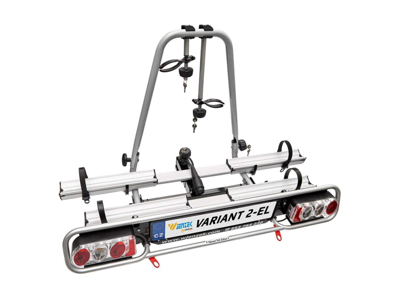 Nosič jízdních kol na tažné zařízení Wjenzek Variant 2 Elektro je určen k přepravě 2 jízdních kol. Držák kol na tažné zařízení byl vyvíjen tak, aby bylo dosaženo maximální bezpečnosti při přepravě kol. Současně bylo naší snahou zachovat jeho snadné a praktické použití. Tento typ nosiče elektrokol na kouli je speciálně upraven pro snadnější převoz elektrokol. Toho je docíleno především rozšířenou roztečí mezi upnutými koly.