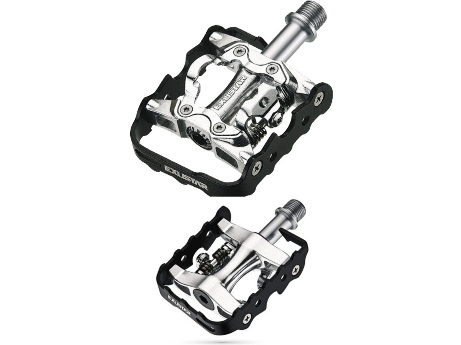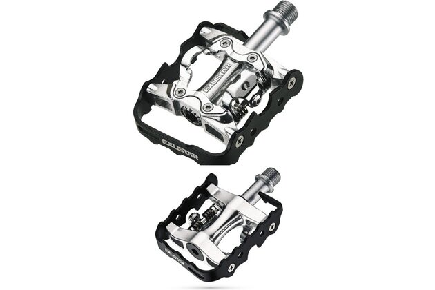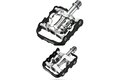 Všestranné pedály s trojitým rozhraním: 1. nášlapný mechanismus na jedné straně pro tretry, a na druhé straně, 2. jednoduchá platforma pro běžnou obuv, 3. nebo možnost přidání klipsny a popruhů pro zvýšení efektivity šlapání.
