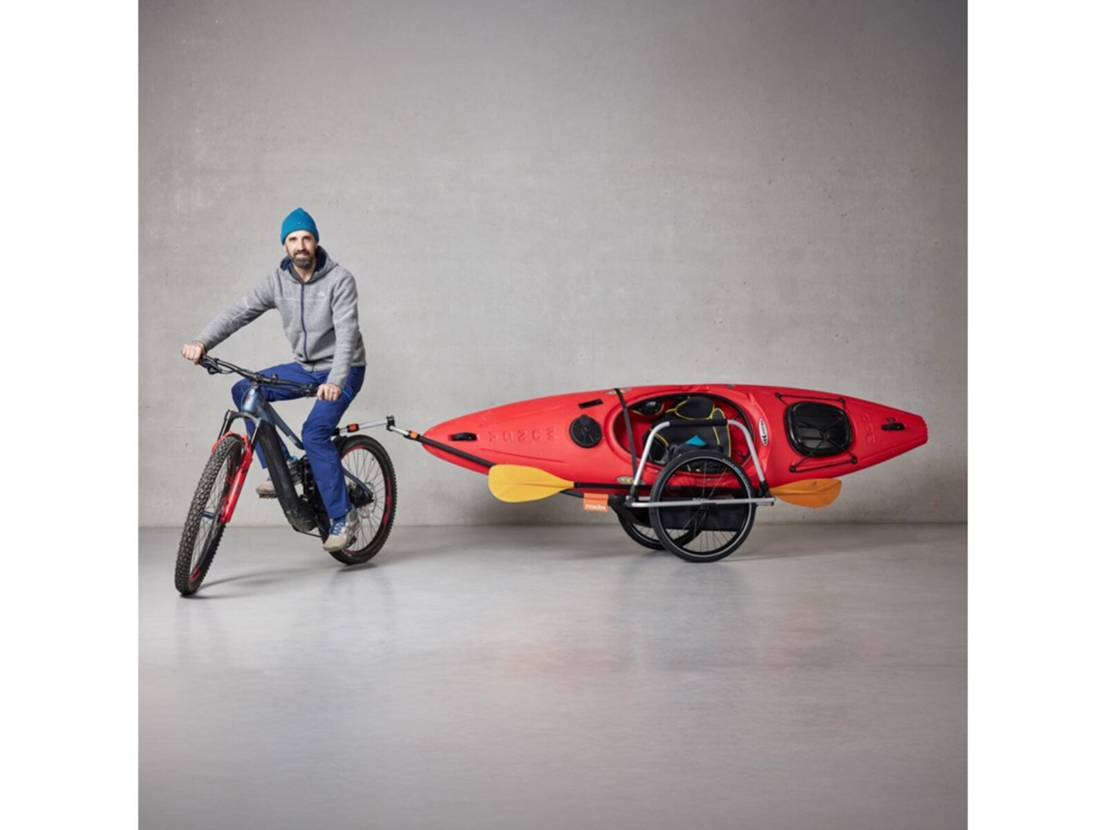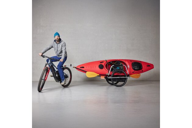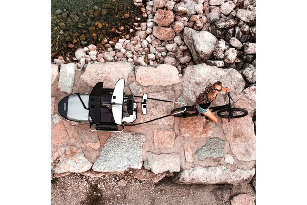 Reacha Sport vyniká svou všestranností. S nastavitelnou ojí a rámem je ideální pro přepravu dlouhého nebo nadrozměrného vybavení, jako jsou surfovací prkna, kajaky nebo sportovní tašky. Jednoduše přejdete od ručního tažení k připojení k vašemu kolu pomocí snadno použitelného cyklistického konektoru.