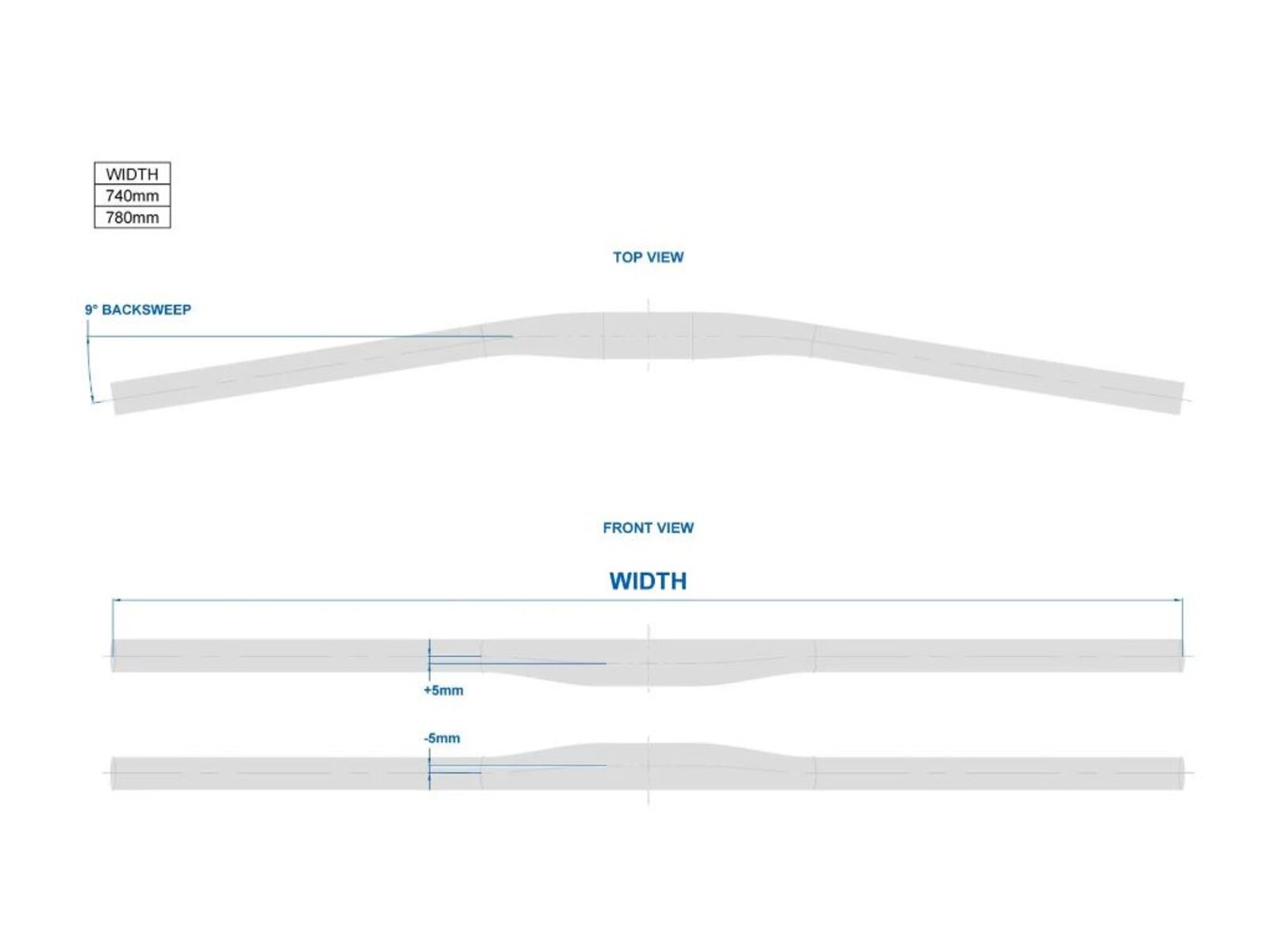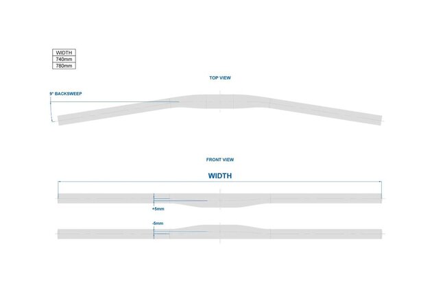 Řídítka mají šířku 740 mm, zdvih 20 mm, povrchová úprava je matná černá. Hmotnost 280 g. Backsweep: 9°. Rise +/- 5 mm.