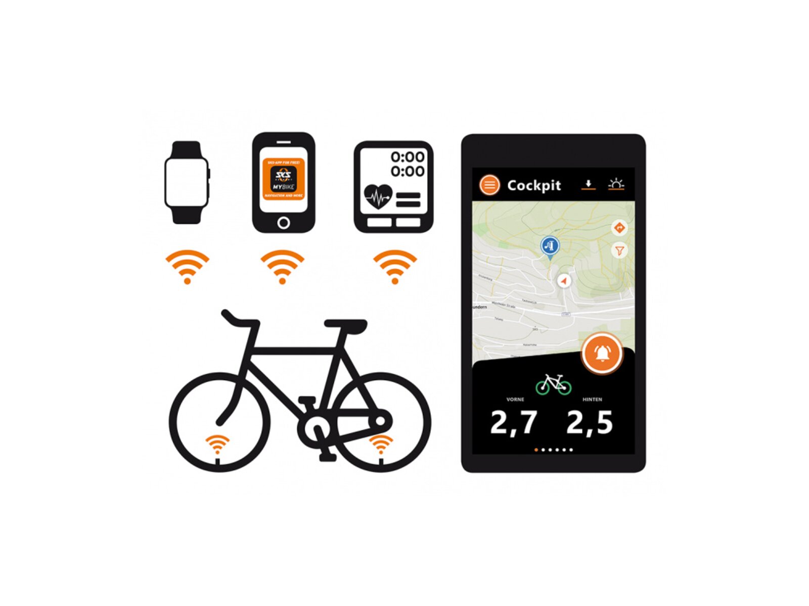 • Aplikace SKS MYBIKE: Zobrazuje aktuální tlak, teplotu a stav baterie senzoru.