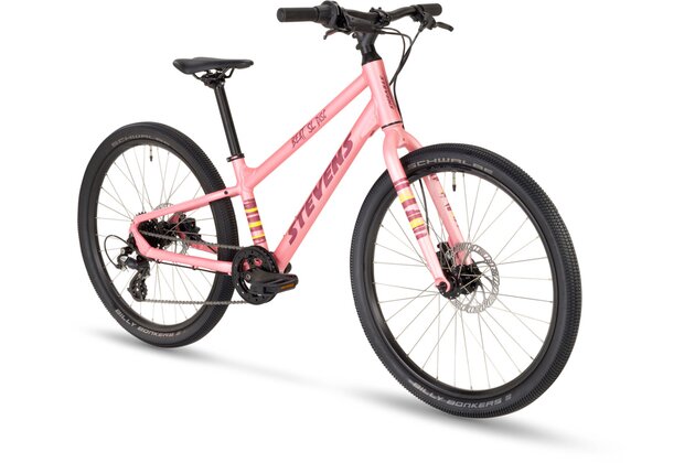 Kolo je osazeno hravými, ale funkčními plášti Schwalbe Billy Bonkers pro hladký chod a dobrý grip. Nabízí se v barvách Lime, Vivid Blue a Wild Rose.