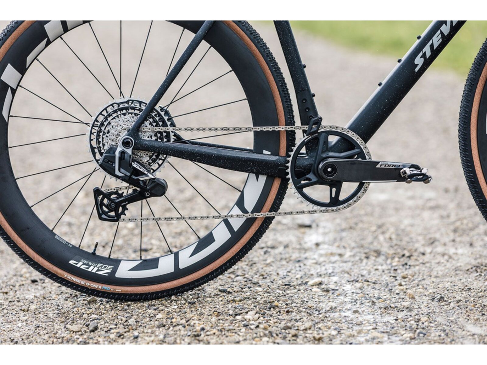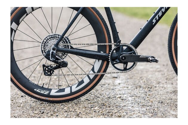 Pohon zajišťuje nejnovější bezdrátová sada SRAM Force XPLR AXS s unikátním 13rychlostním řazením. V kombinaci s převodníkem 44T a kazetou 10–46T nabídne rozsah pro ostré závody i dobrodružné výpravy. Karbonová kola Zipp 303 XPLR S jsou navržena pro gravel – lehká, tuhá a odolná. O jistý kontakt s terénem se postarají rychlé a přilnavé pláště Schwalbe G-One R Pro.