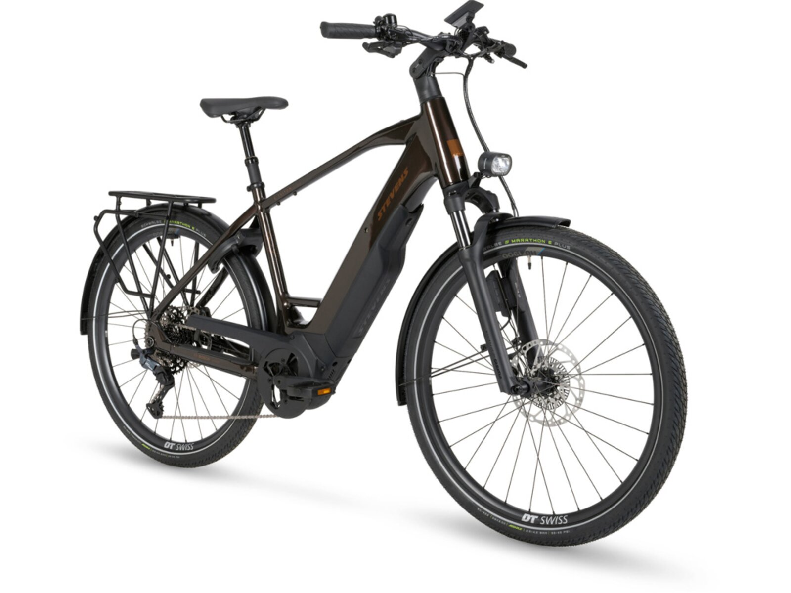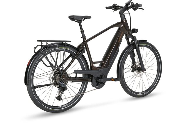 Kromě moderní geometrie a ergonomického posedu nabízí kolo také výjimečný komfort a bezpečnost. Vpředu pracuje odpružená vidlice SR Suntour Mobie34 se zdvihem 80 mm, brzdění zajišťují čtyřpístkové brzdy Shimano Deore s ABS systémem Bosch. Nechybí ani luxusní osvětlení Supernova M99 Pro s dálkovým světlem nebo pohodlné prvky jako nastavitelný představec a ergonomické sedlo Selle Royal Vivo.