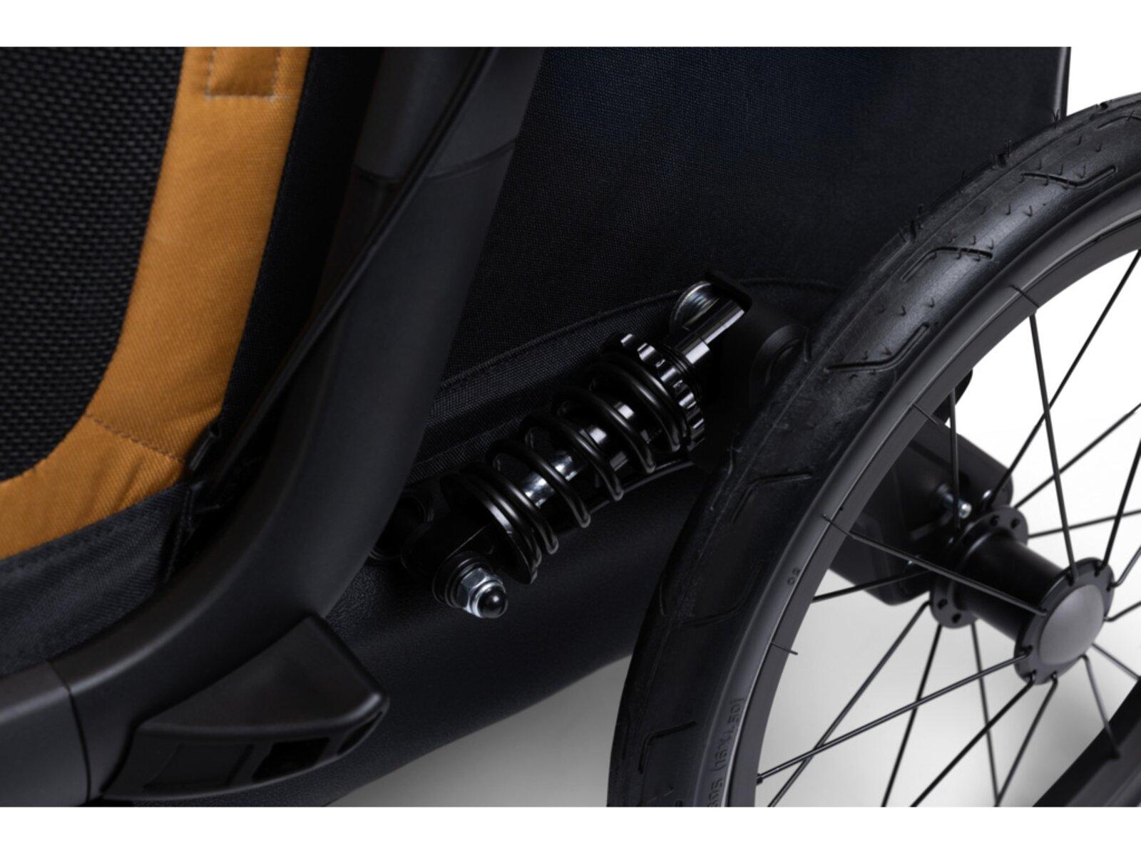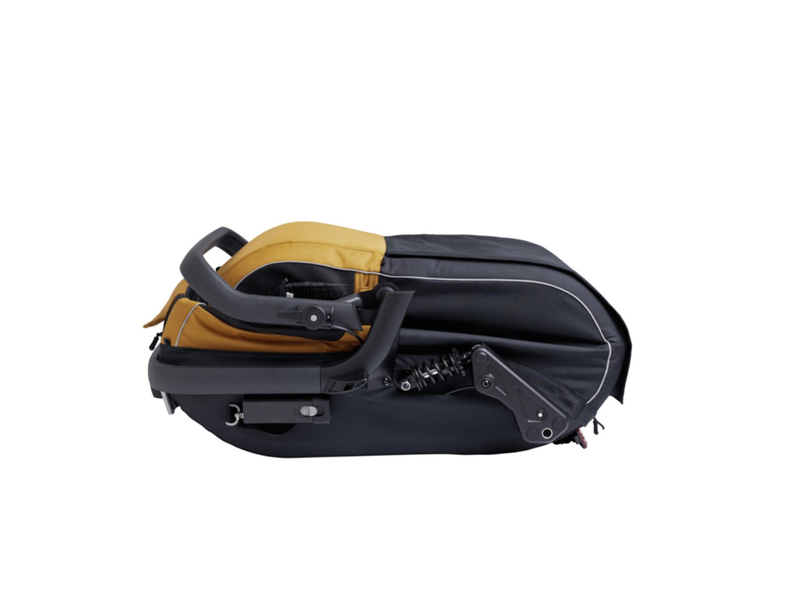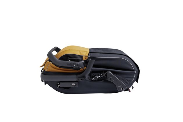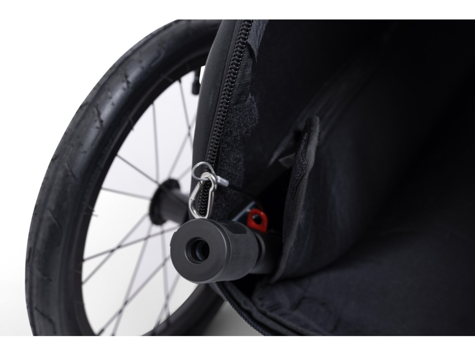 • Integrovaná kapsa na tažnou tyč: Pokud vozík nepoužíváte za kolem (např. při skladování nebo přestavbě na kočárek), lze rameno pro připojení ke kolu úhledně schovat do vyhrazené kapsy uvnitř vozíku.