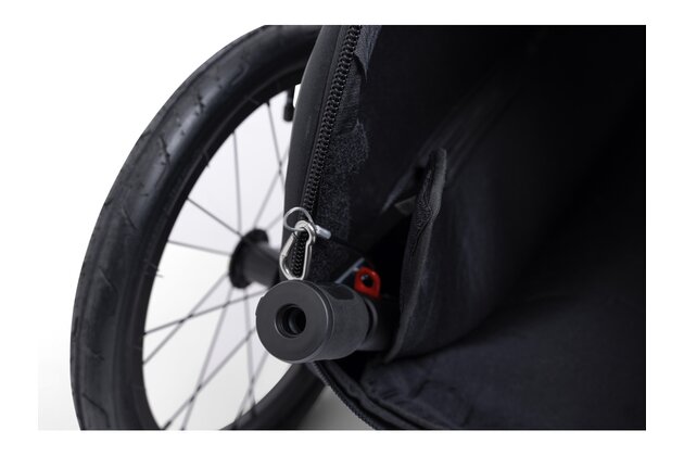• Možnost rozšíření na kočárek: Pomocí doplňkového kočárkového kolečka (prodává se samostatně) snadno proměníte cyklovozík v praktický kočárek pro pěší procházky. Kočárkové kolečko má navíc svou vlastní úložnou kapsu přímo na vozíku.